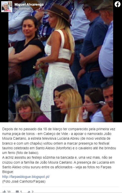 “Depois de no passado dia 18 de março ter comparecido pela primeira vez numa praça de toiros – em Cabeço de Vide – a apoiar o namorado João Moura Caetano, a estrela televisiva Luciana Abreu voltou ontem a marcar presença no festival taurino celebrado em Santo Aleixo e o cavaleiro até lhe brindou um ferro“, escreveu Miguel Alvarenga, crítico de tauromaquia.