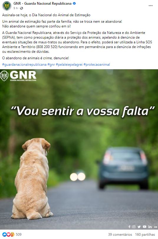 Esta terça-feira, dia 11 de abril, e no âmbito do Dia Nacional do Animal de Estimação, a Guarda Nacional Republicana (GNR) recorreu à rede social Facebook para apelar a que “não abandone quem sempre confiou em si”.