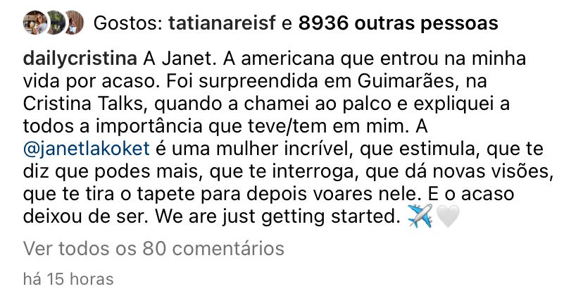 “A Janet a americana que entrou na minha vida por acaso. Foi surpreendida em Guimarães, no evento Cristina Talks, quando a chamei ao palco e expliquei a todos a importância que ela teve\têm em mim. Janet é uma mulher incrível, que estimula, que te encoraja a ir além, que te faz questionar, que traz novas perspectivas, que te desafia para depois te ver voar. E o acaso deixou de ser”, compartilhou Cristina Ferreira nesta terça-feira, dia 20.