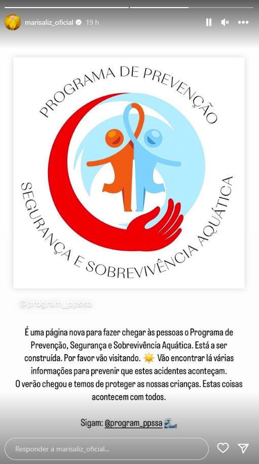 Esta quinta-feira, 22 de junho, Marisa Liz utilizou a sua conta de Instagram para dar destaque ao “Programa de Prevenção Segurança e Sobrevivência Aquática”. Este é um programa de prevenção contra os afogamentos infantis.