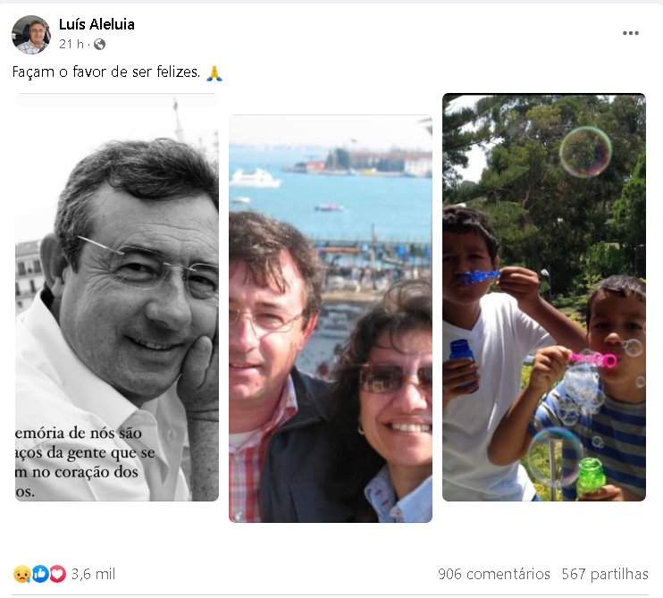 Cerca de doze horas antes de ser conhecida a notícia da sua morte, Luís Aleluia fez uma publicação nas redes sociais. Nela, destacou fotografias ao lado da mulher e dos dois filhos, onde escreveu a frase emblemática de Raul Solnado: “Façam o favor de ser felizes”.