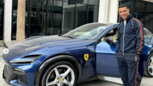 Na primeira imagem, o famoso jogador surge com um grande sorriso, a segurar a sua filha mais nova, Bella Esmeralda, nos braços. Já na segunda, aparece em pé ao lado de um dos seus automóveis, um Ferrari Purosangue de cor azul.