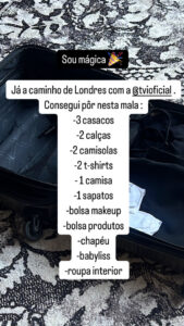 “Sou mágica. Já a caminho de Londres com a TVI”, começou por escrever nos seus stories. “Consegui pôr nesta mala: três casacos, duas calças, duas camisolas, duas t-shirts, uma camisa, uns sapatos, bolsa de maquilhagem, bolsa de produtos, chapéu, babyliss e roupa interior”, disse orgulhosa.