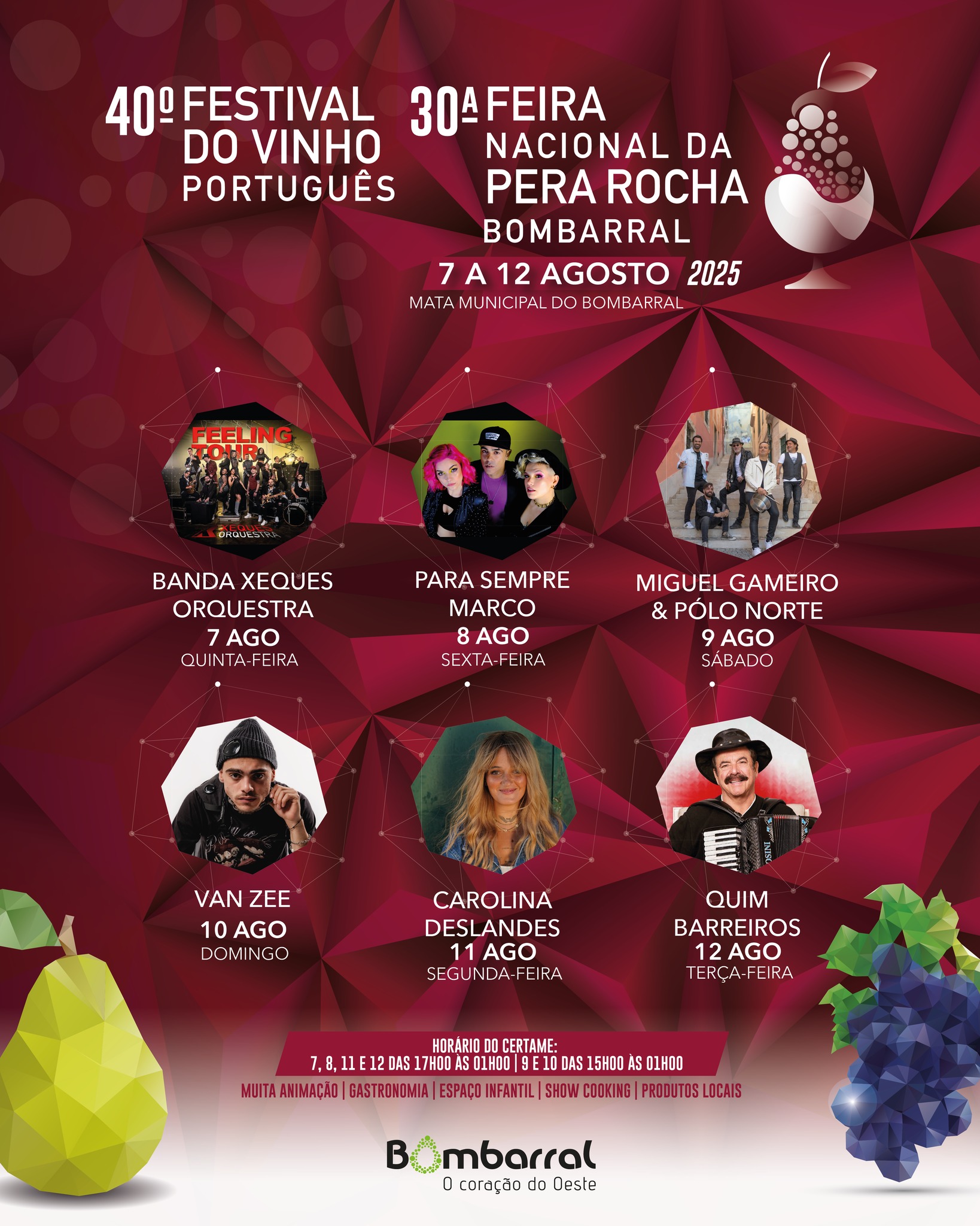 De 7 a 12 de agosto, a Mata Municipal do Bombarral vai receber o 40.º Festival do Vinho Português e a 30.ª Feira Nacional da Pera Rocha.