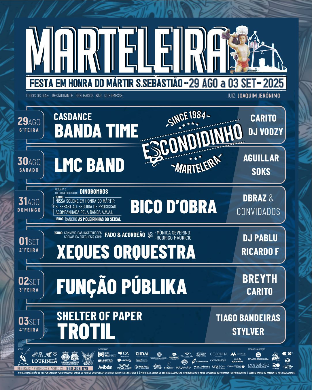 Ao longo dos seis dias, o palco “Escondidinho” vai receber nomes como: Carito, DJ Vodzy, Aguilar, Soks, DBraz & Convidados, DJ Pablu, Ricardo F, Tiago Bandeiras e StyLver.