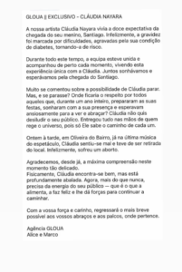“A nossa artista Cláudia Nayara vivia a doce expectativa da chegada do seu menino, Santiago. Infelizmente, a gravidez foi marcada por dificuldades, agravadas pela sua condição de diabetes, tornando-a de risco. Durante todo este tempo, a equipa esteve unida e acompanhou de perto cada momento, vivendo esta experiência única com a Cláudia. Juntos sonhávamos e esperávamos pela chegada do Santiago. Muito se comentou sobre a possibilidade de a Cláudia parar. Mas e se parasse? Onde ficaria o respeito por todos aqueles que, durante um ano inteiro, prepararam as suas festas. Sonharam com a sua presença e esperavam ansiosamente para a ver e abraçar? Cláudia não quis desiludir o seu público. Entregou tudo nas mãos de quem rege o universo, pois só ele sabe o caminho de cada um“, pode ler-ser.
