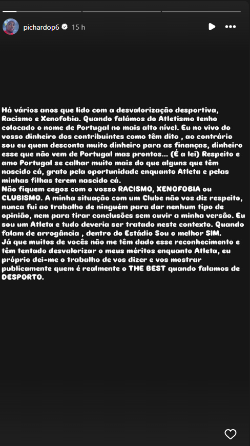 “Há vários anos que lido com a desvalorização desportiva, racismo e xenofobia. Quando falamos do atletismo, tenho colocado o nome de Portugal no mais alto nível. Eu não vivo do vosso dinheiro dos contribuintes, como têm dito. Ao contrário: sou eu quem desconta muito dinheiro para as finanças, dinheiro esse que não vem de Portugal, mas, pronto… É a lei”, escreveu.