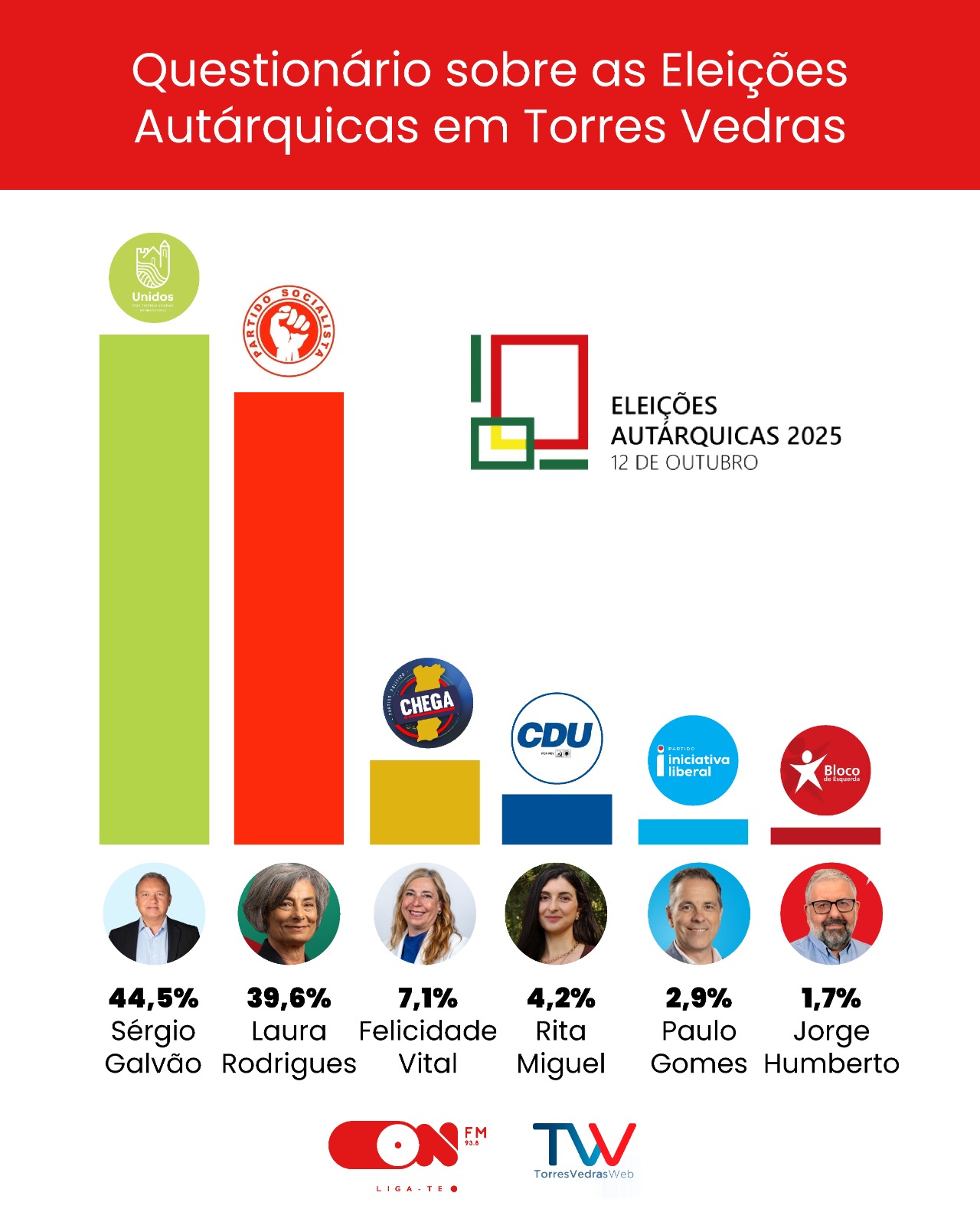 – Sérgio Galvão lidera com 44,5%, o que o coloca com uma ligeira vantagem, embora sem maioria absoluta. A coligação que representa (Unidos por Torres Vedras /PSD/CDS/Volt) recolheu a “simpatia e preferência” dos participantes, possivelmente capitalizando um “desejo de mudança”.