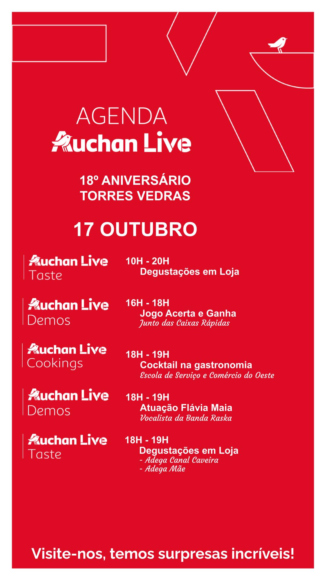 Para assinalar este momento, a loja Auchan Torres Vedras, no Centro Comercial Arena Shopping, vai realizar na sexta-feira, dia 17 de outubro, várias iniciativas na sua loja: degustações, jogo “Acerta e Ganha”, Cocktail na gastronomia e uma atuação da cantora Flávia Maia.