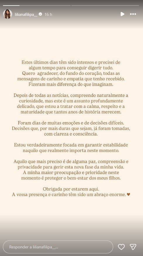 “Estes últimos dias têm sido intensos e precisei de algum tempo para conseguir digerir tudo. Quero agradecer, do fundo do coração, todas as mensagens de carinho e empatia que tenho recebido. Fizeram mais diferença do que imaginam”, começou por escrever Liliana Filipa-