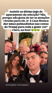 “Assistir ao último jogo de apuramento para a seleção? Não, porque não gosta de ter as atenções viradas para ele. Ir à Casa Branca dar umas palmadinhas nas costas do Trump para a toda a gente ver? Claro, na boa!“, criticou no story sob a partilha da imagem onde aparece o craque com a companheira, Georgina, Elon Musk, entre outras personalidades.