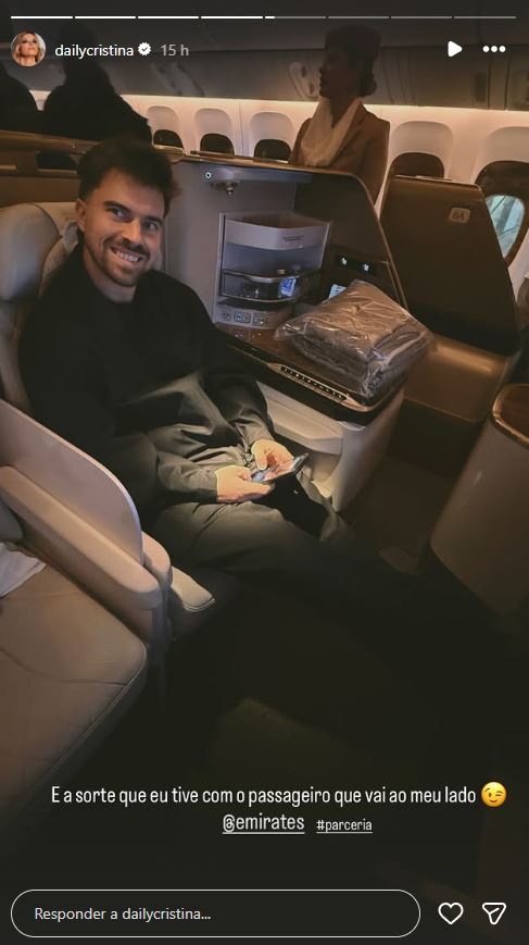 “A sorte que eu tive com o passageiro que vai ao meu lado”, escreveu nos stories do Instagram.
