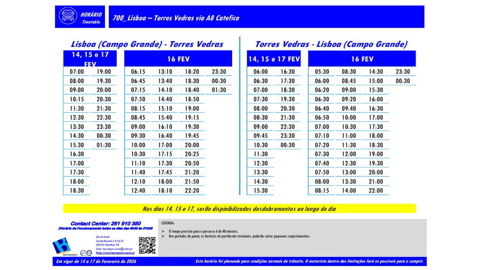 – Carreira 700 – Torres Vedras | Lisboa (via A8 Catefica) – Direta, nos dias 14, 15 e 17 de fevereiro, a carreira operará de acordo com o horário em anexo. Poderá ainda ser equacionada a realização de desdobramentos ao longo do dia, sempre que tal se justifique;