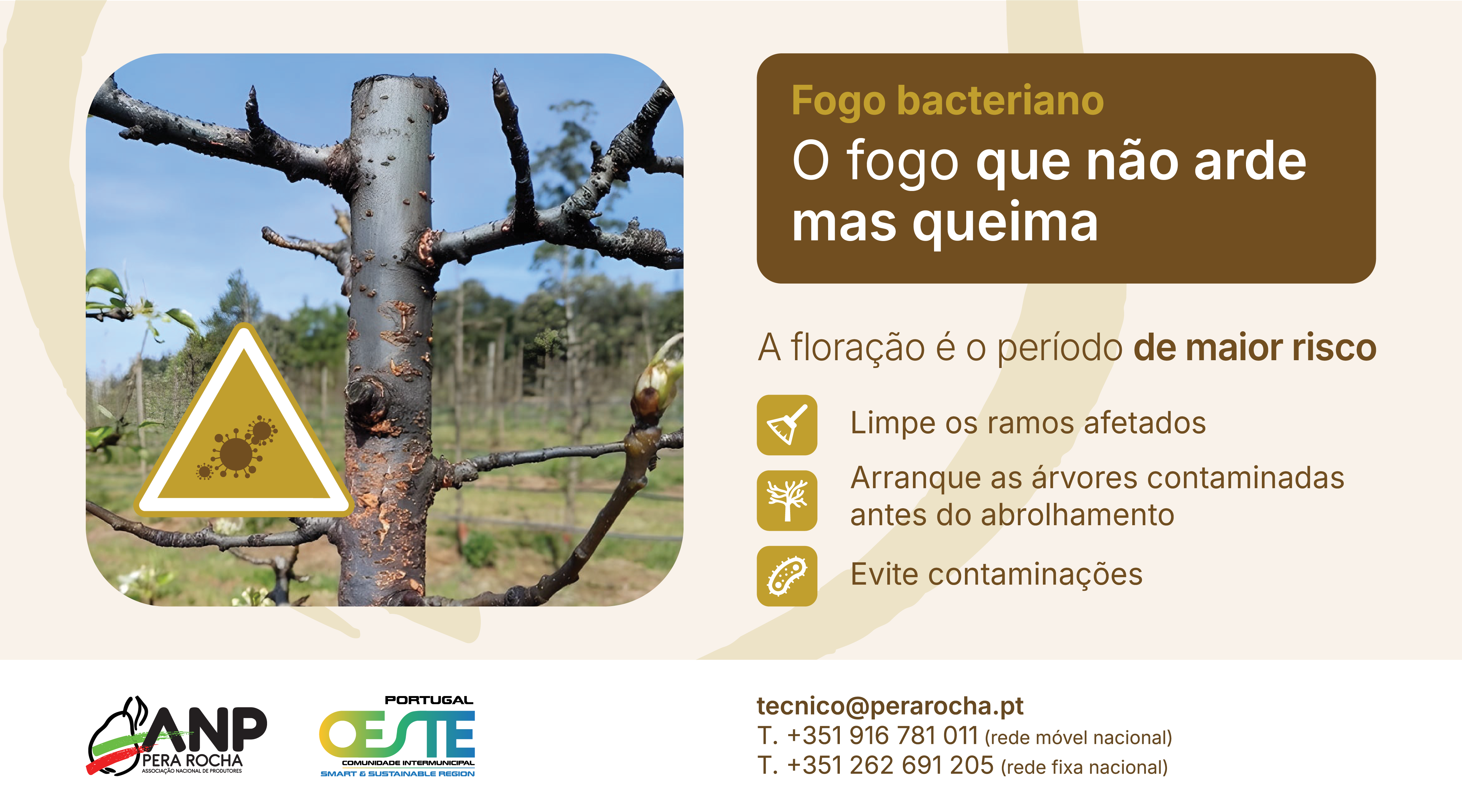 A Comunidade Intermunicipal do Oeste (OesteCIM), em articulação com a Associação Nacional de Produtores de Pera Rocha (ANP), alerta os produtores agrícolas da região para o aumento do risco de fogo bacteriano.