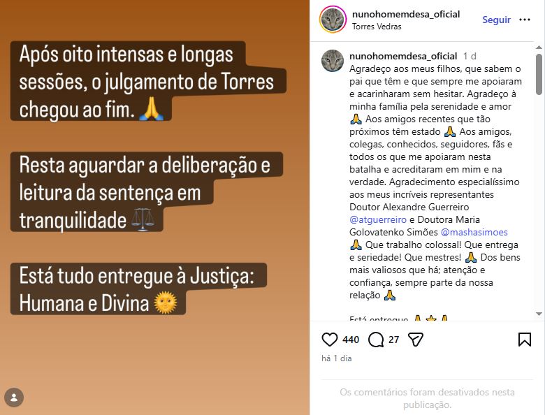 “Após oito intensas e longas sessões, o julgamento de Torres [Vedras] chegou ao fim. Resta aguardar a deliberação da sentença em tranquilidade. Está tudo entregue à justiça: humana e divina”, escreveu.