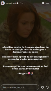 “A família e equipa da Eva quer agradecer do fundo do coração todas as mensagens e demonstrações de apoio. Nós lemos tudo, apesar de não conseguirmos responder a todas as mensagens. Estamos aqui fortes e estaremos até ao fim! Com e para a Eva sempre”, lê-se na mensagem divulgada.