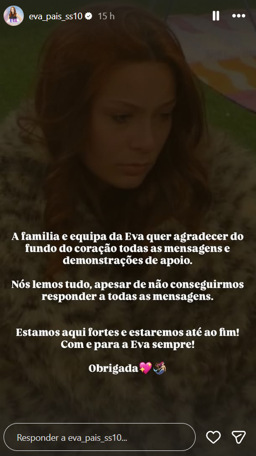 “A família e equipa da Eva quer agradecer do fundo do coração todas as mensagens e demonstrações de apoio. Nós lemos tudo, apesar de não conseguirmos responder a todas as mensagens. Estamos aqui fortes e estaremos até ao fim! Com e para a Eva sempre”, lê-se na mensagem divulgada.