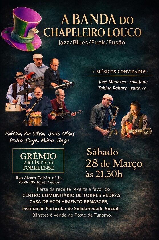 Este sábado, dia 28 de março, pelas 21h30, “A Banda do Chapeleiro Louco” dará um concerto no Grémio Artístico Torreense.